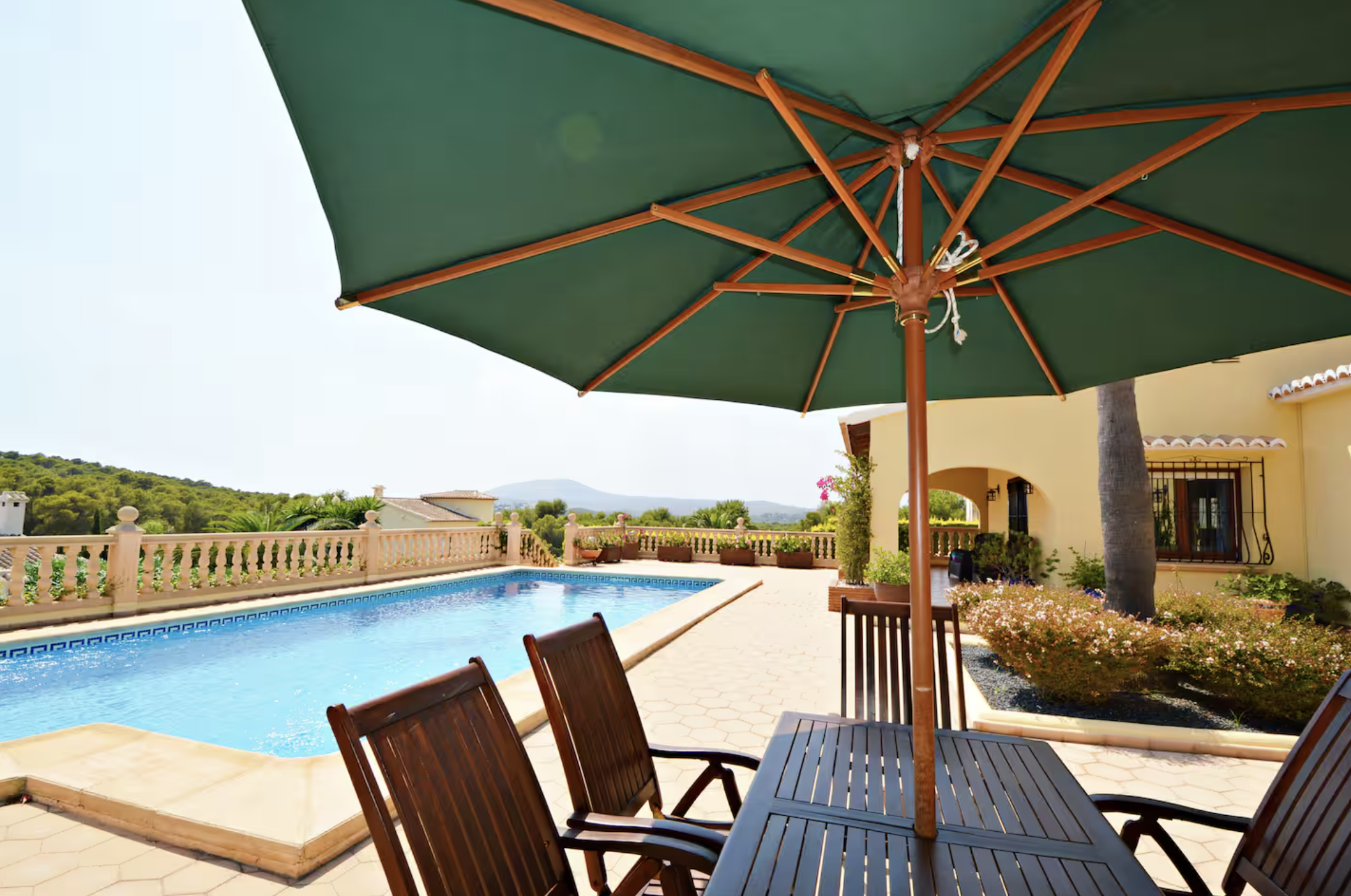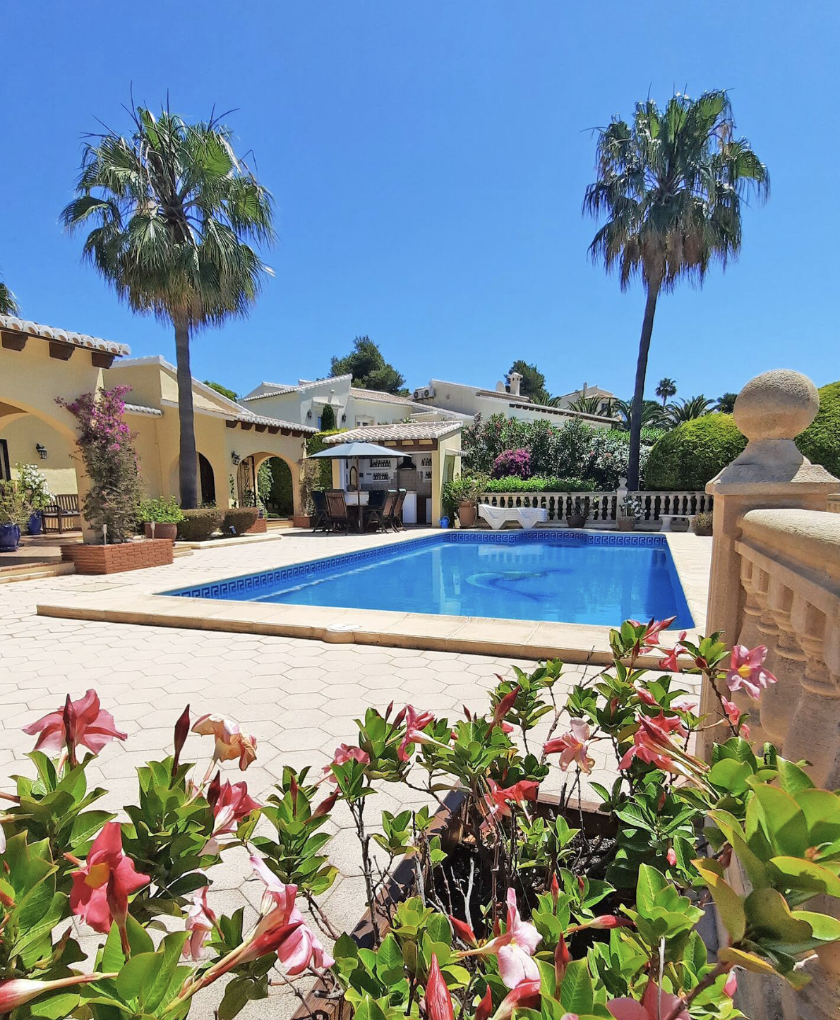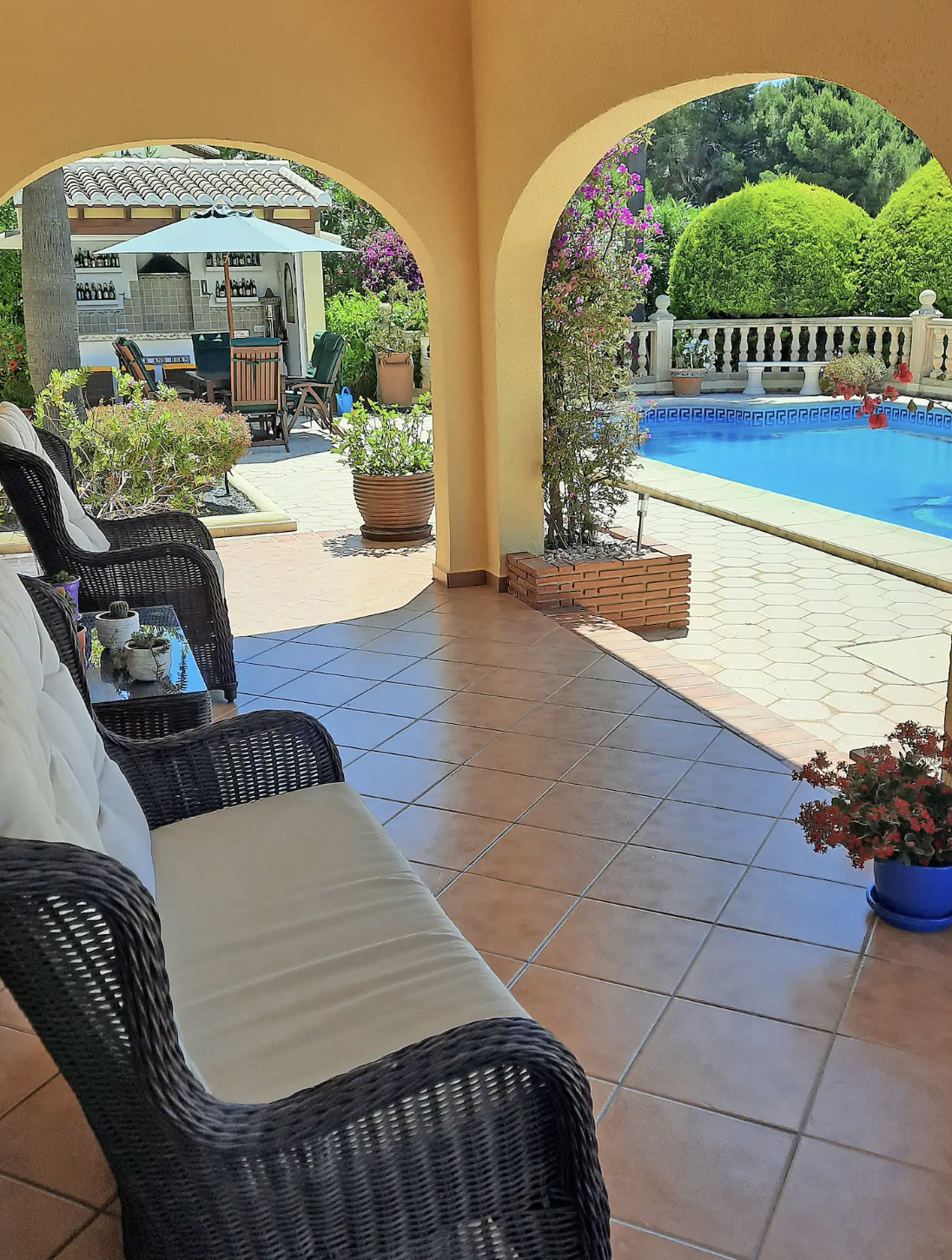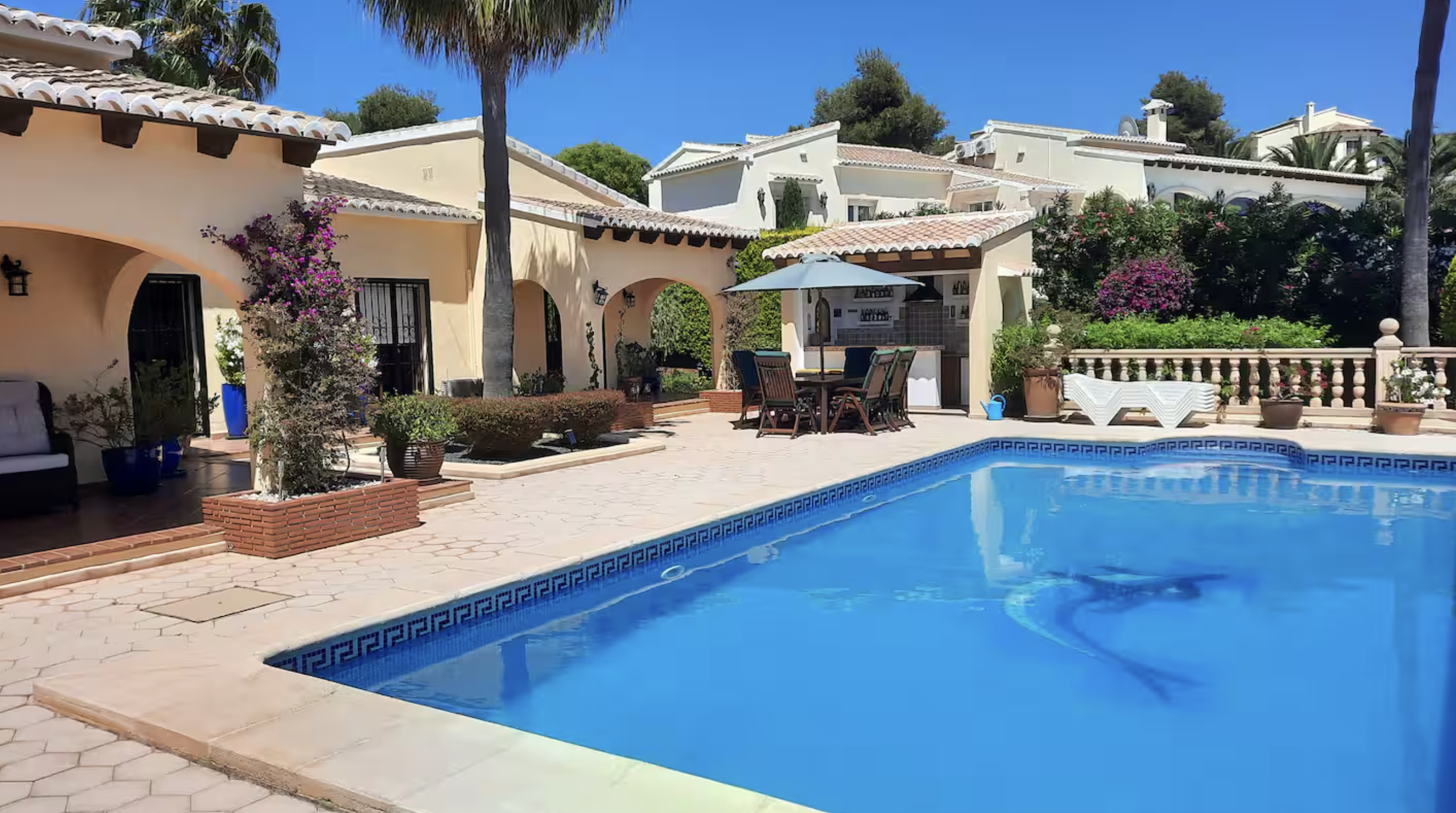 Disponible desde septiembre hasta finales de mayo de 2027. Villa de una sola planta, impecable en todas partes, salón y comedor con cocina abierta con acceso a una gran naya cubierta (terraza), que da a la piscina privada y bonitos jardines, bar exterior y área de cocina, impresionantes vistas hacia las montañas se puede disfrutar, hay 4 dormitorios y 3 dormitorios, aire acondicionado, ventiladores de techo y calefacción central de gas en todas partes, estacionamiento fuera de la carretera para 2 autos, ubicado a poca distancia en automóvil de todos los servicios.